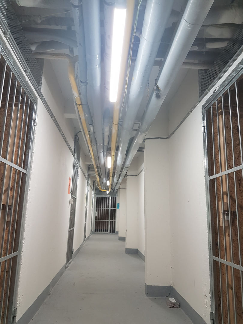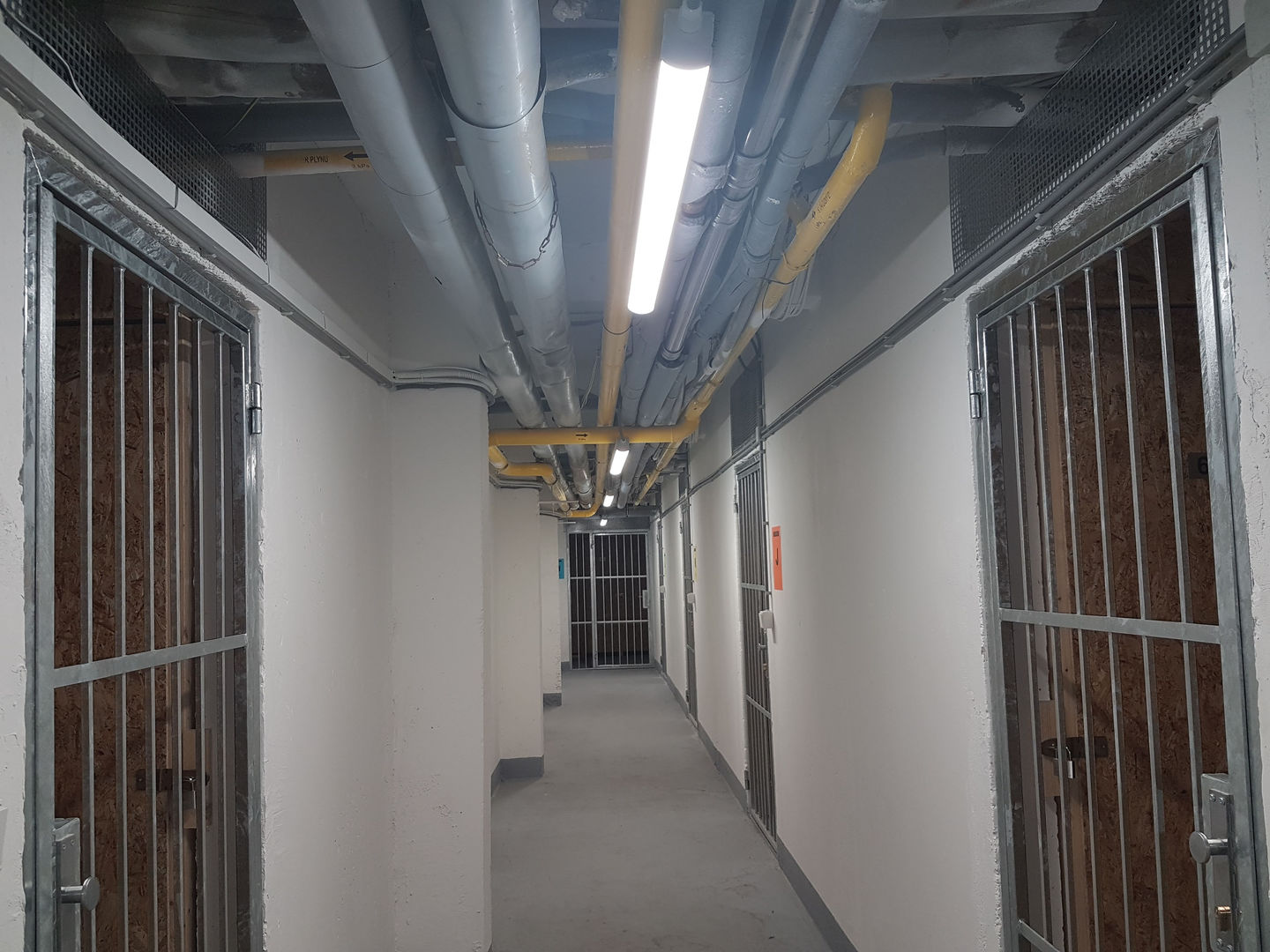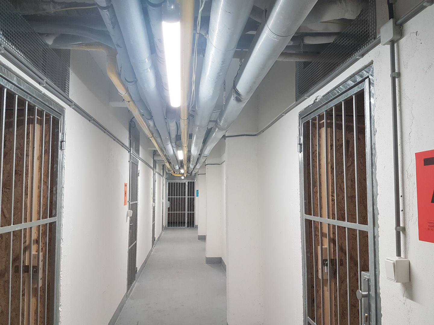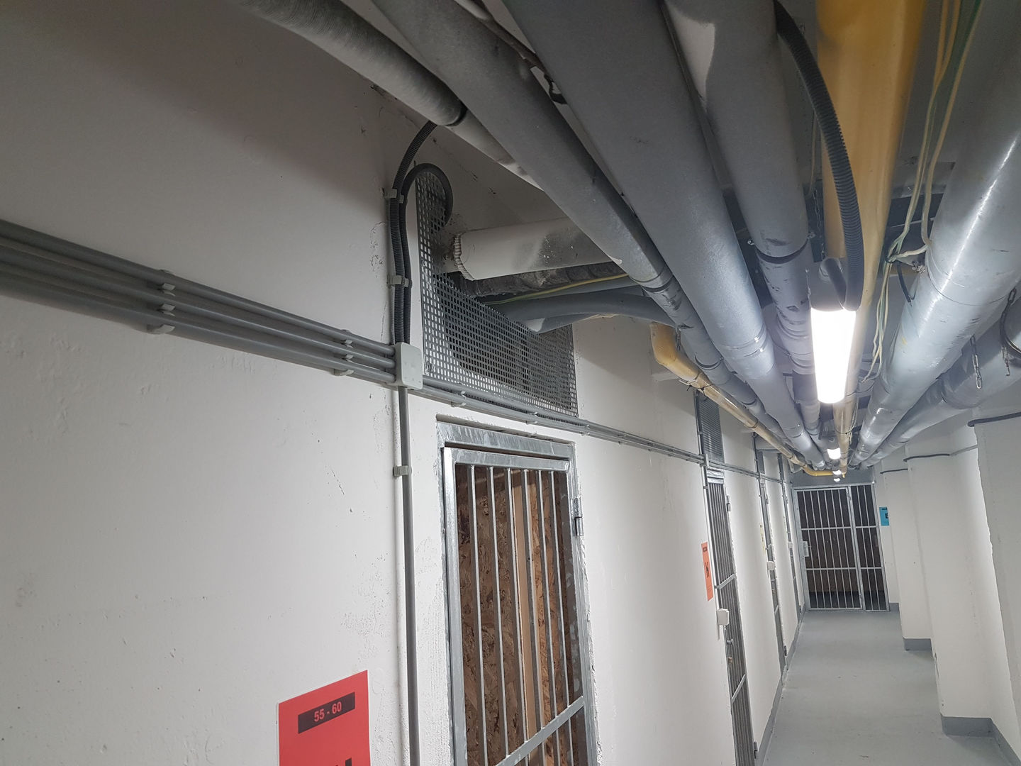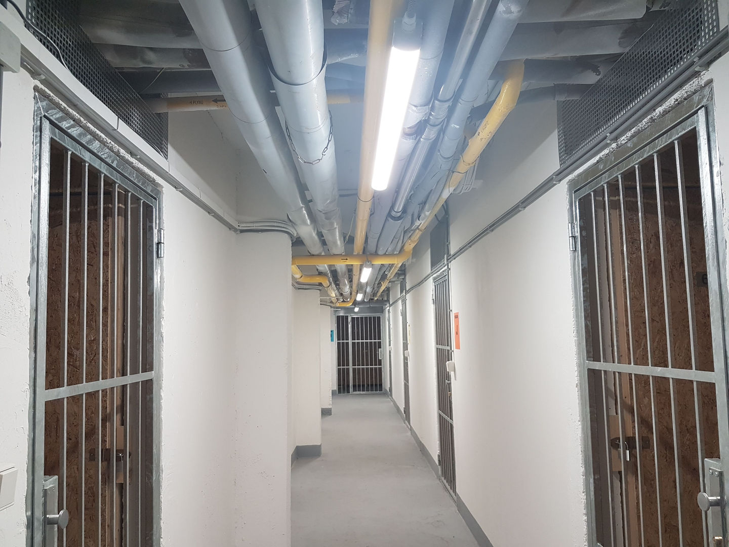 Použili sme prachotesné LED svietidlá PHILIPS 36W, ktoré sme zavesili na retiazky. V každej chodbe pred kobkami sa nachádza dvojica svietidiel kvôli zabezpečeniu dostatočného osvetlenia priestoru v kobkách (nie sú latkové, ale majú plné steny z OSB dosiek). Tento zámer sa nám podaril a obyvatelia majú dostatok svetla aj bez inštalovania svietidiel do kobiek.