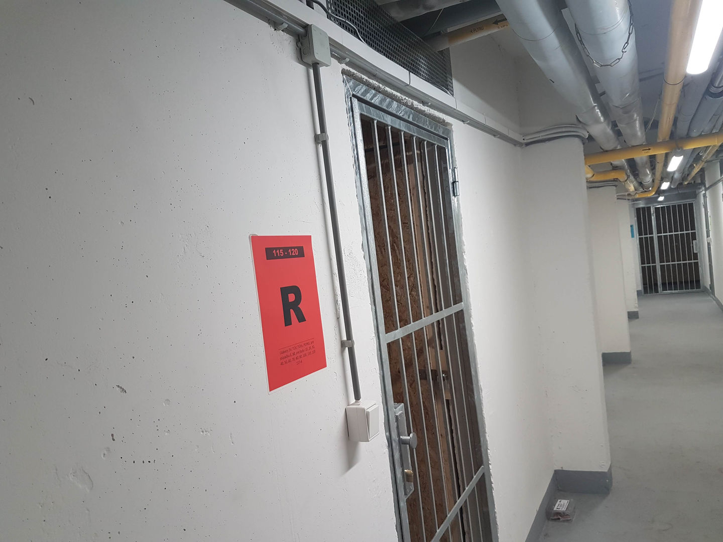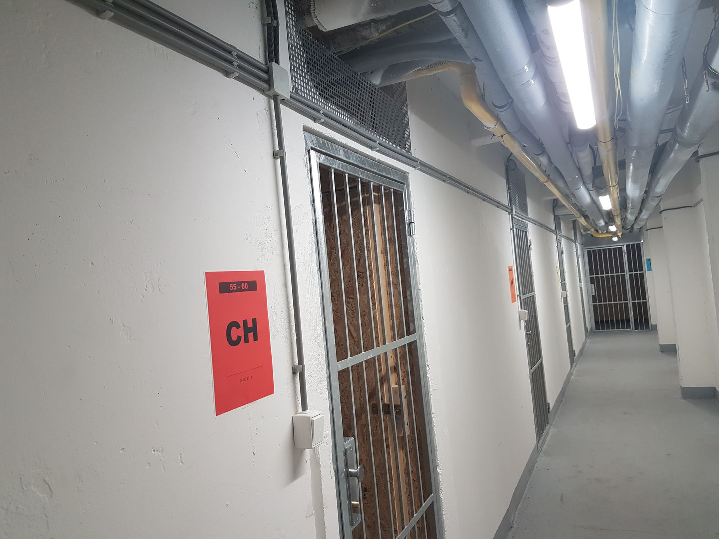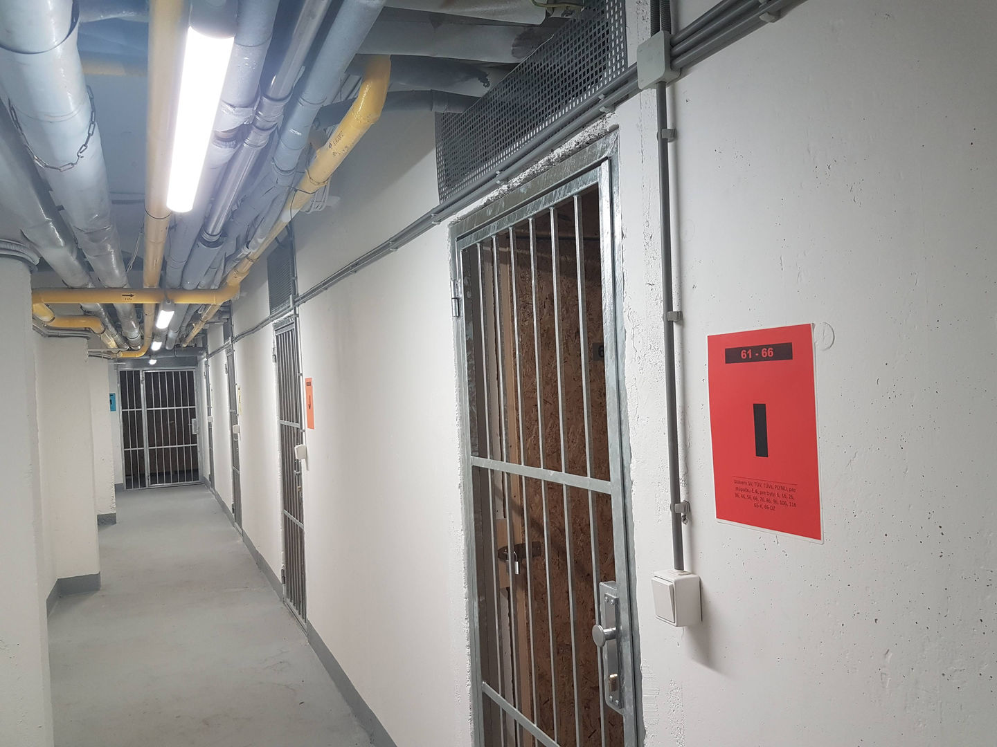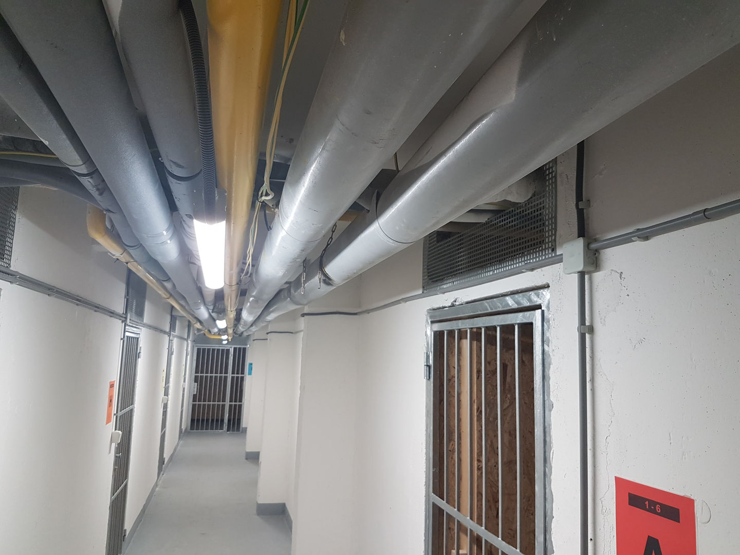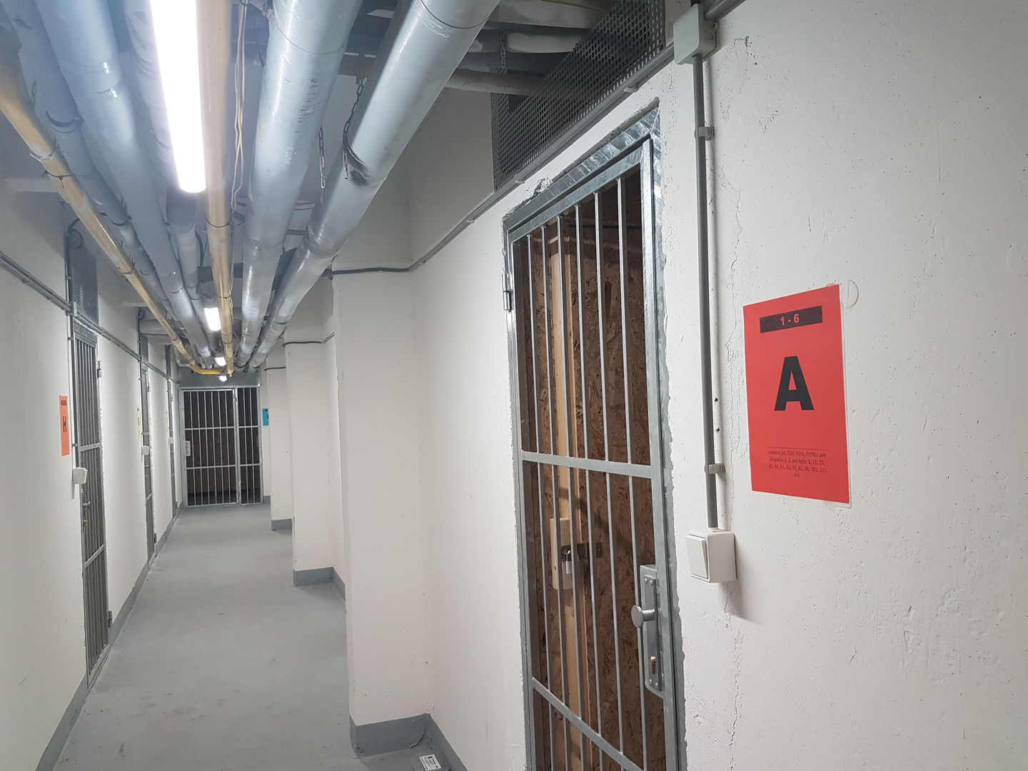 Použili sme prachotesné LED svietidlá PHILIPS 36W, ktoré sme zavesili na retiazky. V každej chodbe pred kobkami sa nachádza dvojica svietidiel kvôli zabezpečeniu dostatočného osvetlenia priestoru v kobkách (nie sú latkové, ale majú plné steny z OSB dosiek). Tento zámer sa nám podaril a obyvatelia majú dostatok svetla aj bez inštalovania svietidiel do kobiek.